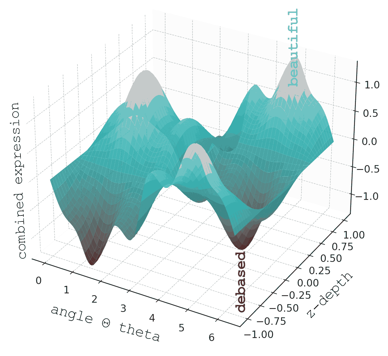 Adding a third dimension transforms the equation into an undulating surface of peaks (harmony) and valleys (discord). This metaphor suggests that the paths to divinity and meaning are oscillatory, requiring balance within infinite possibilities.