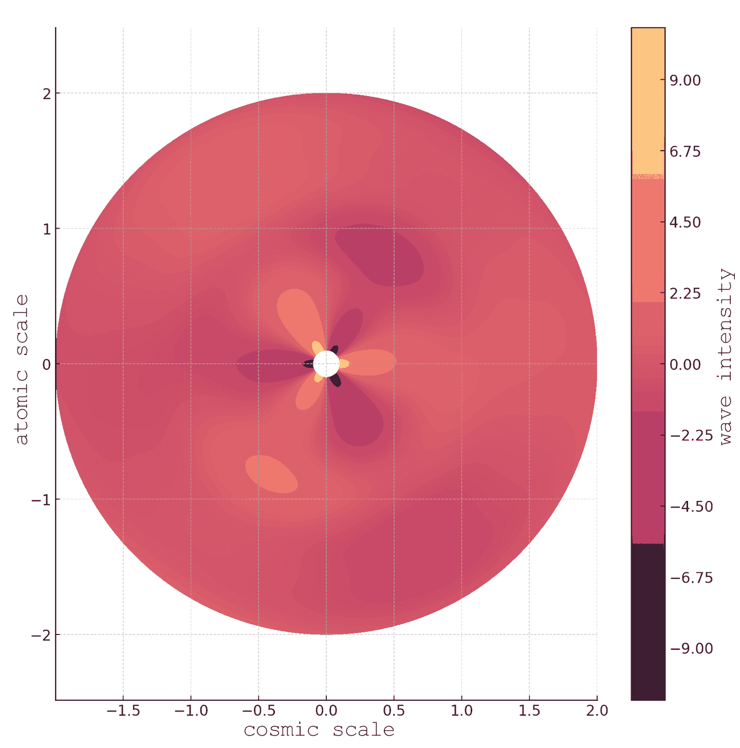 By merging cosmic and atomic scales, radial waveforms reflect galaxies and electron orbits, visualizing humanity’s smallest building blocks alongside the vastness of space and emphasizing universal principles of interconnectedness.